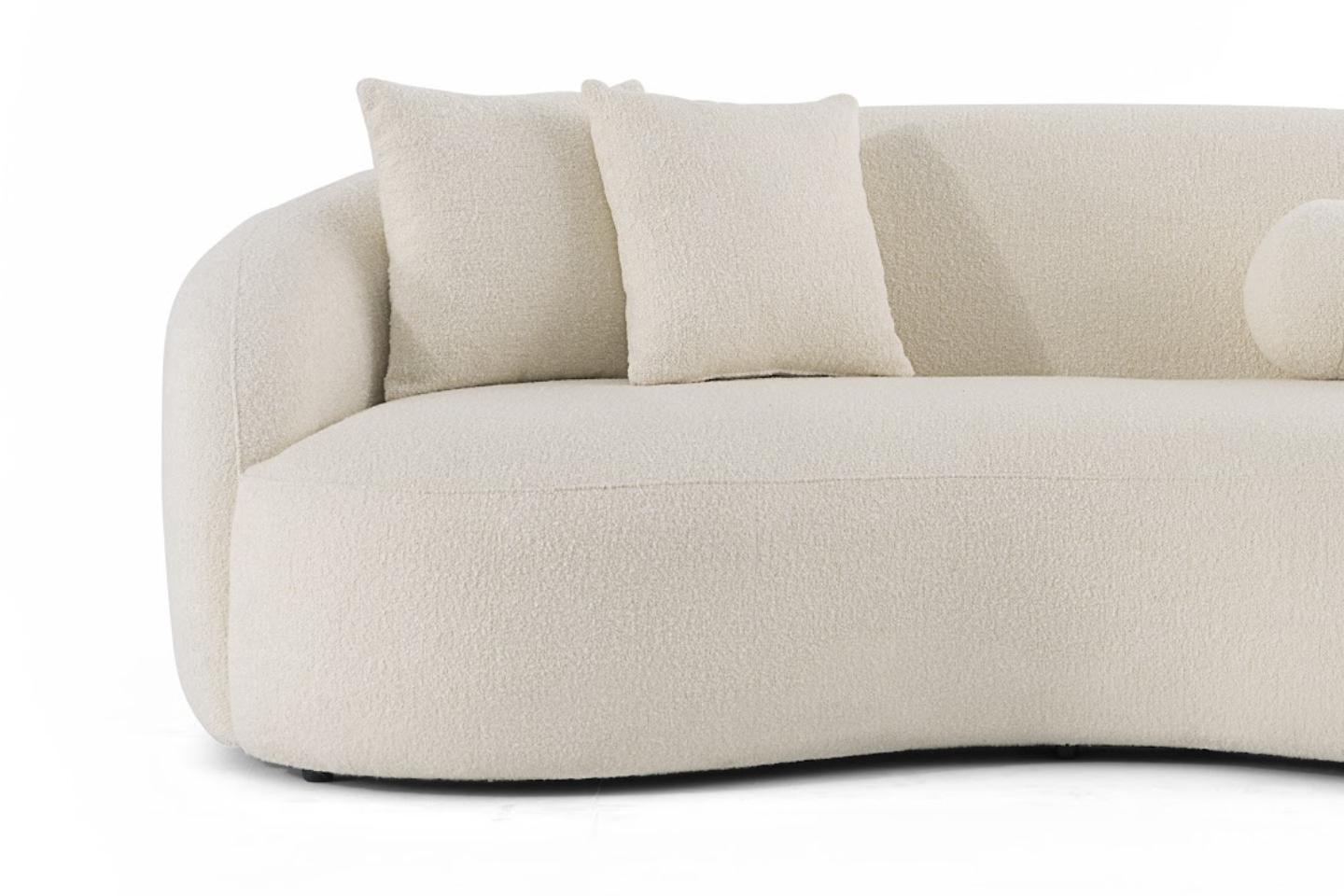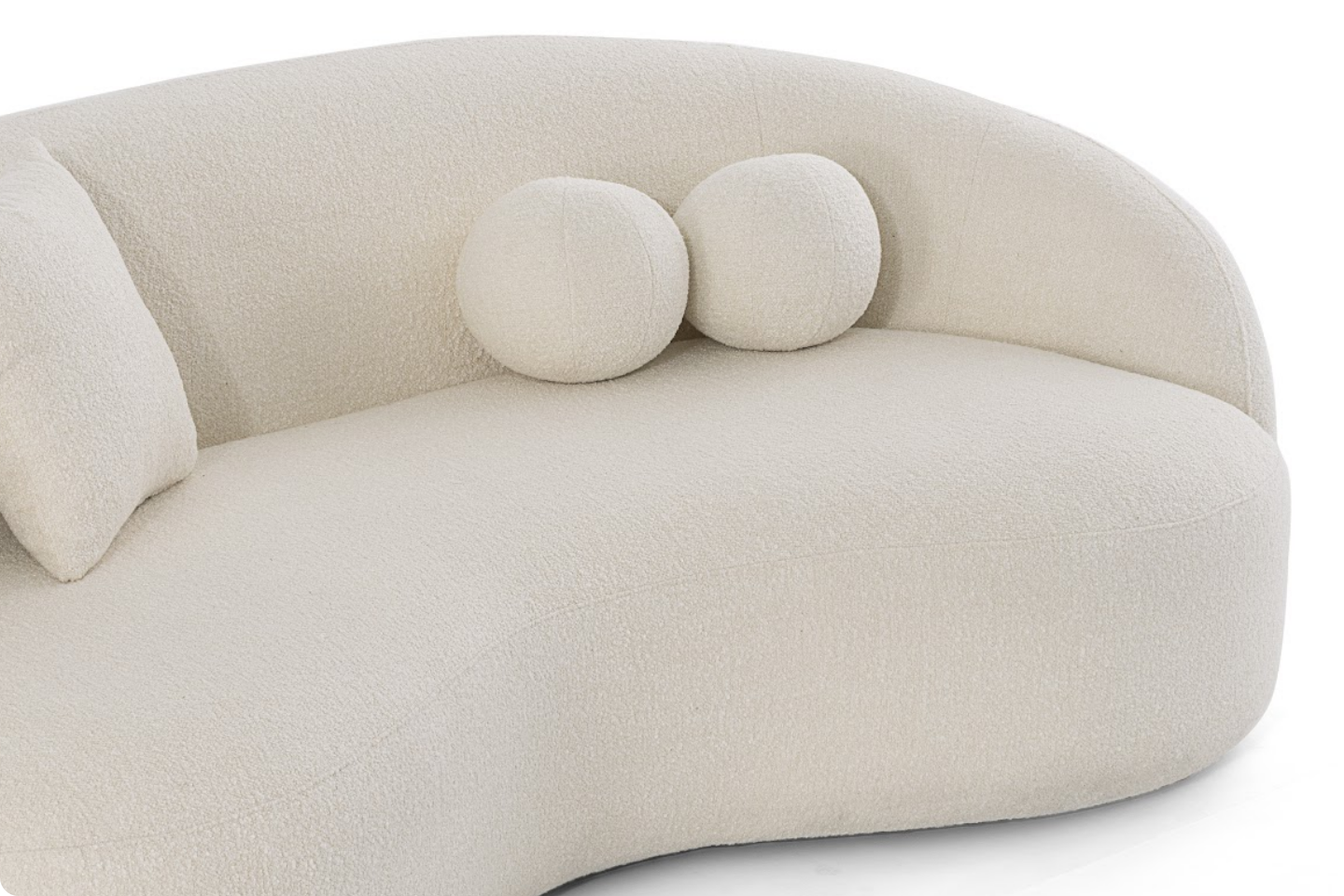 Bella Bouclé sofa generously upholstered in lavish bouclé fabric, renowned for its rich texture and inviting feel. The plush, cushioned seating is further enhanced by the inclusion of a set of elegantly designed round and square-shaped pillows, offering an additional layer of comfort and style.